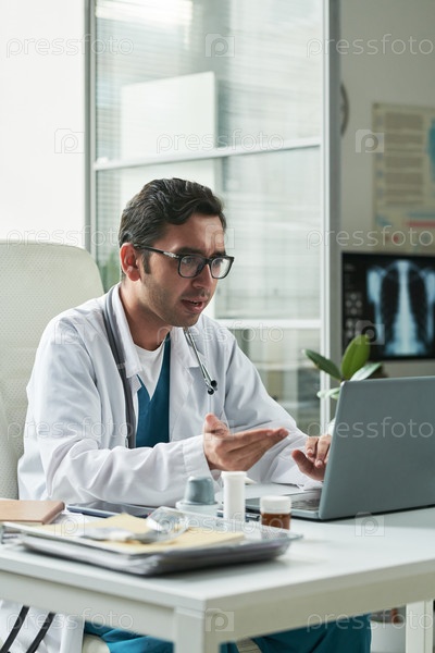 Врач среднего возраста мужского пола консультирует пациента с диабетом онлайн