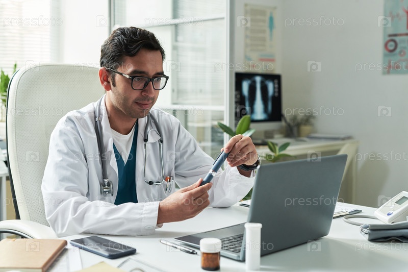 Врач среднего возраста объясняет инсулиновую ручку пациенту с диабетом