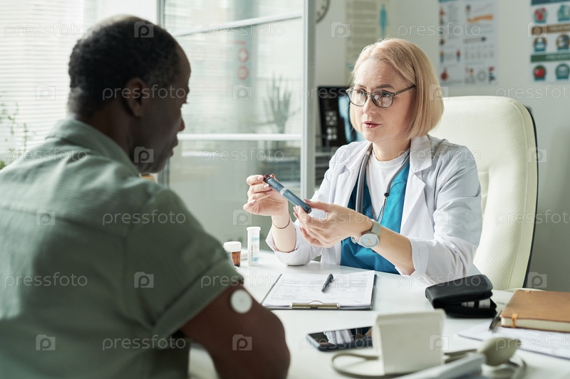 Женщина-врач среднего возраста объясняет инсулиновую ручку черному мужчине