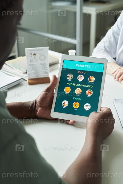 Чернокожий мужчина средних лет просматривает руководство по диабетическому питанию с врачом в клинике