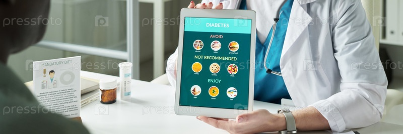 Женщина-врач показывает диаграмму диабетической диеты чернокожему мужчине среднего возраста