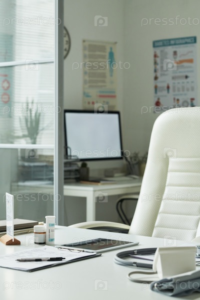 Пустой медицинский кабинет, показывающий оборудование для консультации пациентов с диабетом