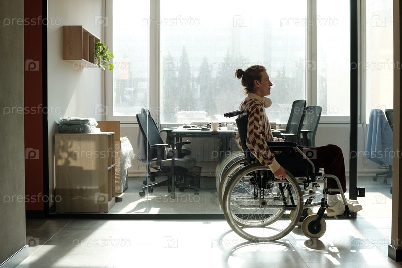 Молодой взрослый мужчина, использующий инвалидное кресло Работает в творческом коворкинг-пространстве