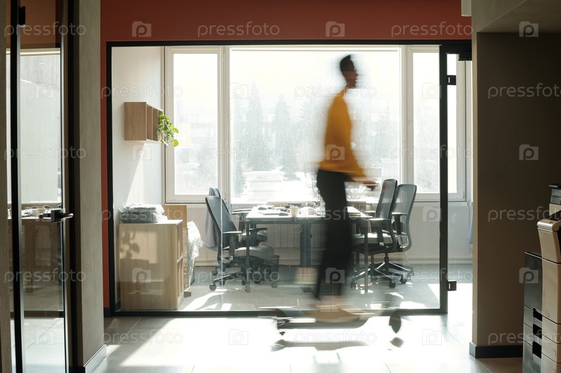 Молодой взрослый чернокожий мужчина едет на скутере Прошлое современный креативный коворкинг офис