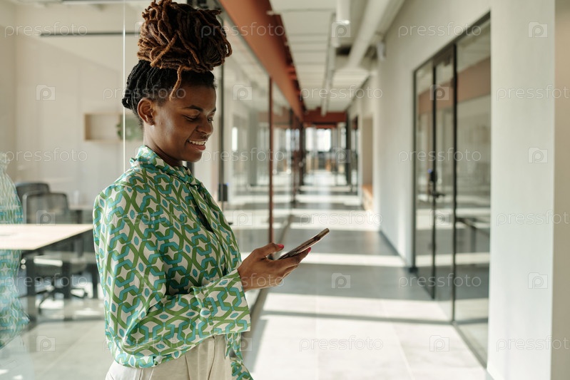 Улыбающаяся молодая взрослая чернокожая женщина использует смартфон в современном творческом коворкинге
