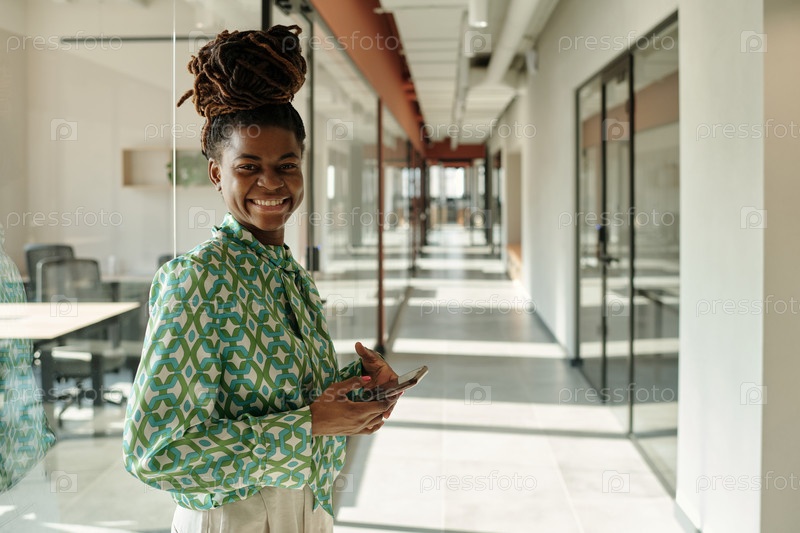 Портрет молодой взрослой чернокожей женщины, улыбающейся при использовании смартфона в коворкинге