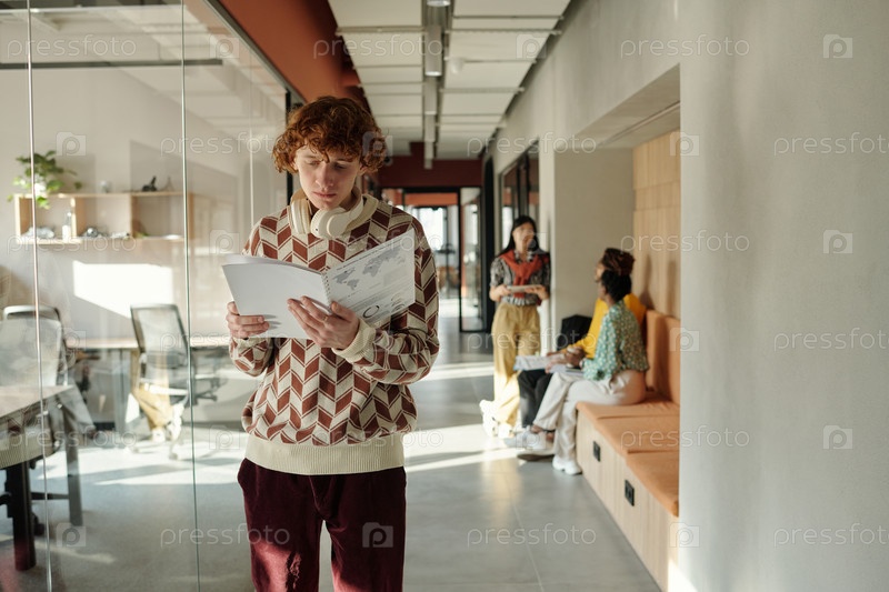 Молодой человек читает документы, пока коллеги сотрудничают в офисе