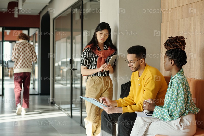 Сотрудничество молодых взрослых азиатских женщин и чернокожих мужчин и женщин в современном коворкинг-пространстве