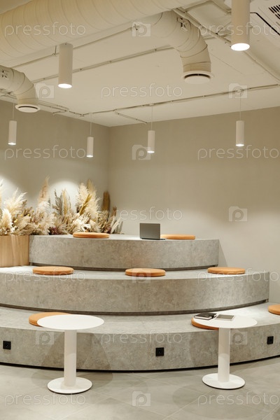 Выставка современного творческого коворкинг-пространства с минималистическим расположением сидений