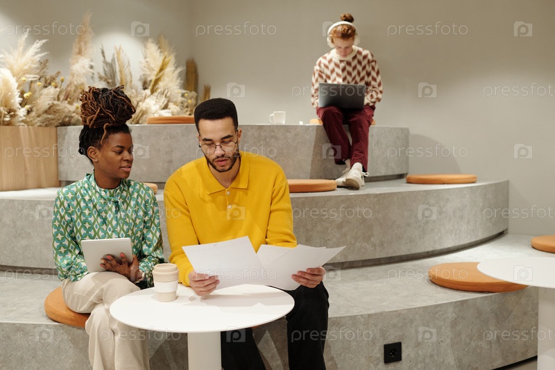 Сотрудничество молодой взрослой чернокожей женщины и молодого взрослого чёрного мужчины в коворкинг-пространстве