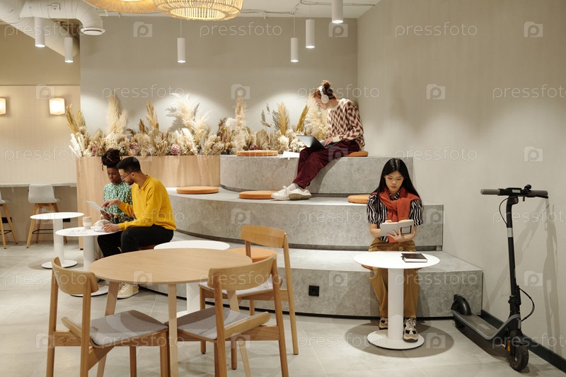 Изучение и сотрудничество молодых взрослых в творческом интерьере коворкинг-пространства