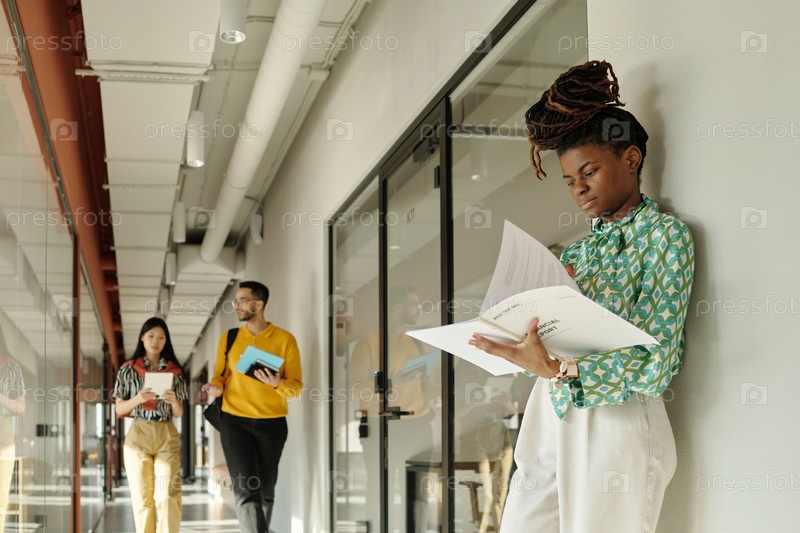 Документы чтения молодой взрослой чернокожей женщины в творческом коворкинг-пространстве