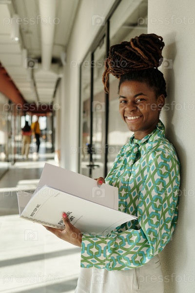 Портрет молодой взрослой чернокожей женщины, улыбающейся во время чтения документов в коворкинге