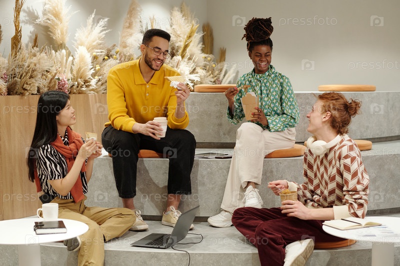 Улыбающиеся молодые взрослые из разных этнических групп, сотрудничающие в творческом коворкинг-пространстве