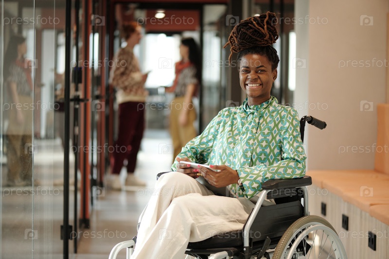 Портрет молодой взрослой чернокожей женщины, улыбающейся во время работы в креативном коворкинге