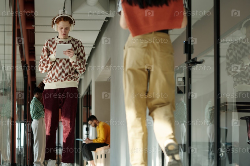 Слушать музыку на планшете от молодого человека в творческом коворкинг-пространстве