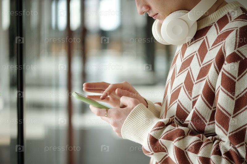 Использование смартфона молодым взрослым мужчиной, носящим наушники в коворкинг-пространстве