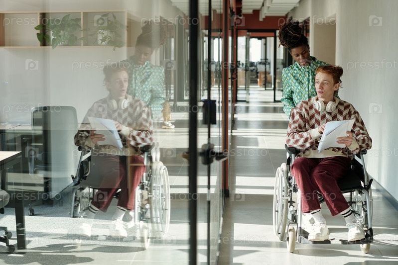 Просмотр документов Молодой человек в инвалидном кресле с чернокожей женщиной, помогающей