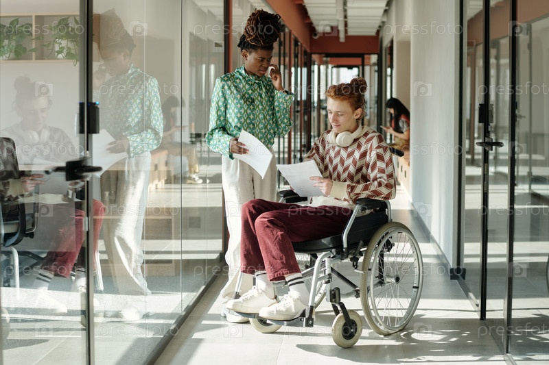 Просмотр печатных документов Молодой человек в инвалидном кресле с чернокожей женщиной
