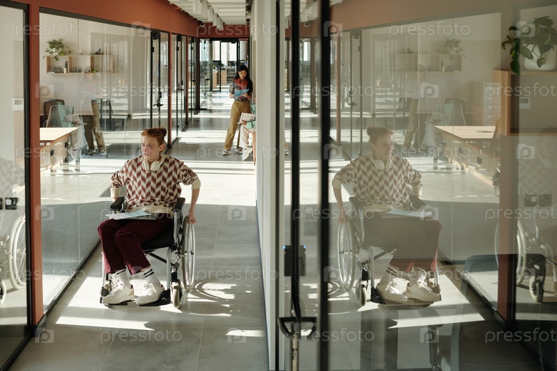 Молодая женщина на инвалидном кресле работает в творческом коворкинг-пространстве