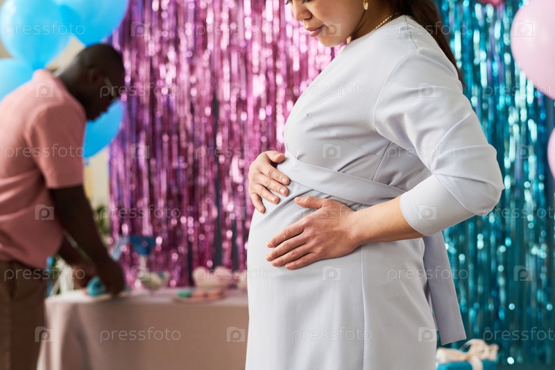 Беременная молодая взрослая азиатская женщина касается живота, в то время как чернокожий мужчина устраивает стол