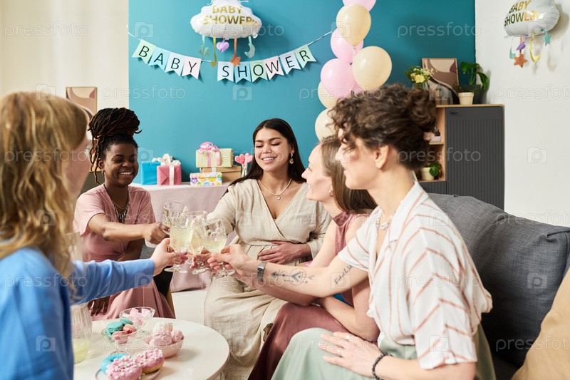 Разнообразные молодые взрослые женщины, приносящие тосты и улыбающиеся во время собрания по раскрытию пола