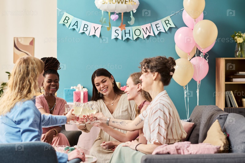Группа молодых взрослых женщин, празднующих вечеринку по раскрытию пола с тостами