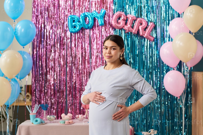 Портрет беременной молодой женщины, стоящей перед розово-синими украшениями и держащей живот
