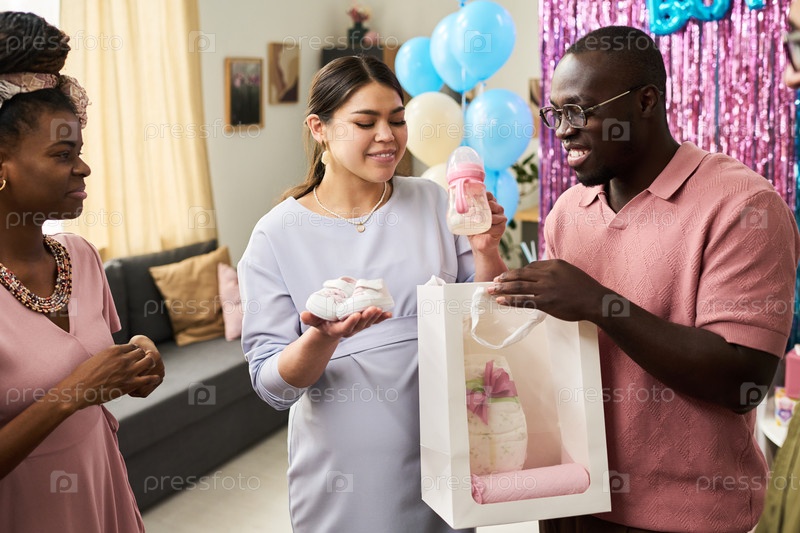 Молодая беременная азиатская женщина получает детские туфли во время вечеринки по раскрытию пола