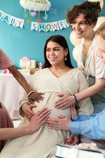 Мультиэтнические молодые взрослые женщины, празднующие гендер, раскрывают прикосновения к беременному животу