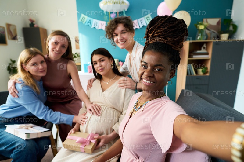 Группа молодых взрослых женщин, празднующих вечеринку по раскрытию пола и улыбающихся