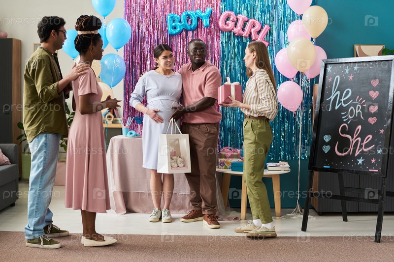 Мультиэтническая группа молодых взрослых и одна беременная женщина празднуют вечеринку по раскрытию пола