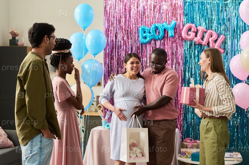 Мультиэтнические молодые взрослые празднуют вечеринку по раскрытию пола с беременной женщиной