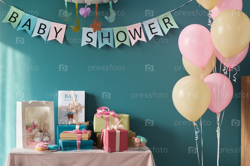 Стол украшен для вечеринки по раскрытию пола с упакованными подарками, воздушными шарами и баннером детского душа