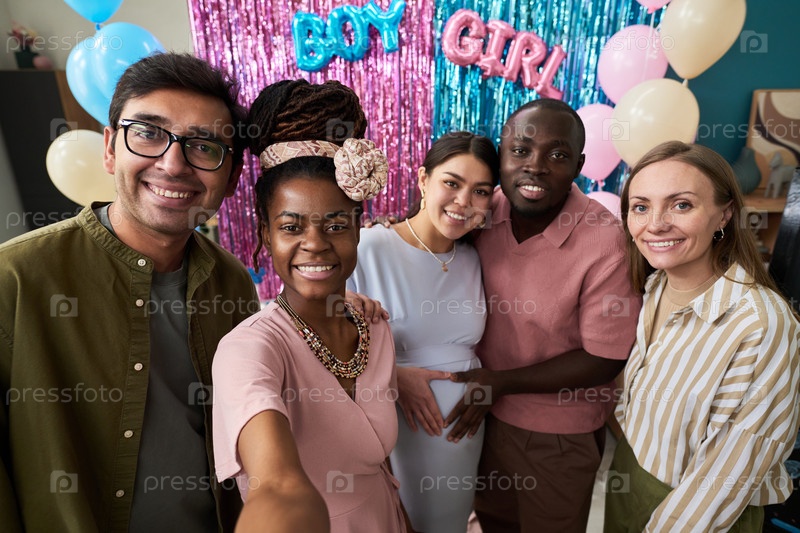 Беременная азиатская женщина стоит в центре с чернокожим мужчиной и женщиной на вечеринке по раскрытию пола