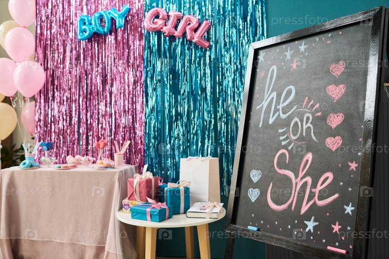 Декорированный пол раскрывает столик вечеринки, на котором отображаются подарки и знак Chalkboard