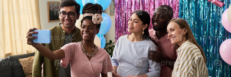 Разнообразные молодые взрослые позируют для селфи и улыбаются на собрании по раскрытию пола