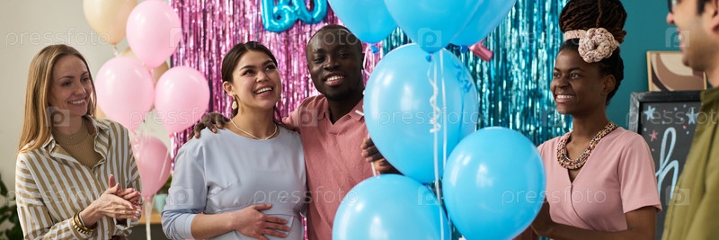 Разнообразные молодые взрослые празднуют вечеринку по раскрытию пола с воздушными шарами, улыбаясь
