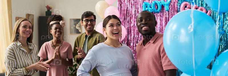 Разнообразная группа молодых взрослых и мужчин и женщин среднего возраста, улыбающихся на вечеринке по раскрытию пола
