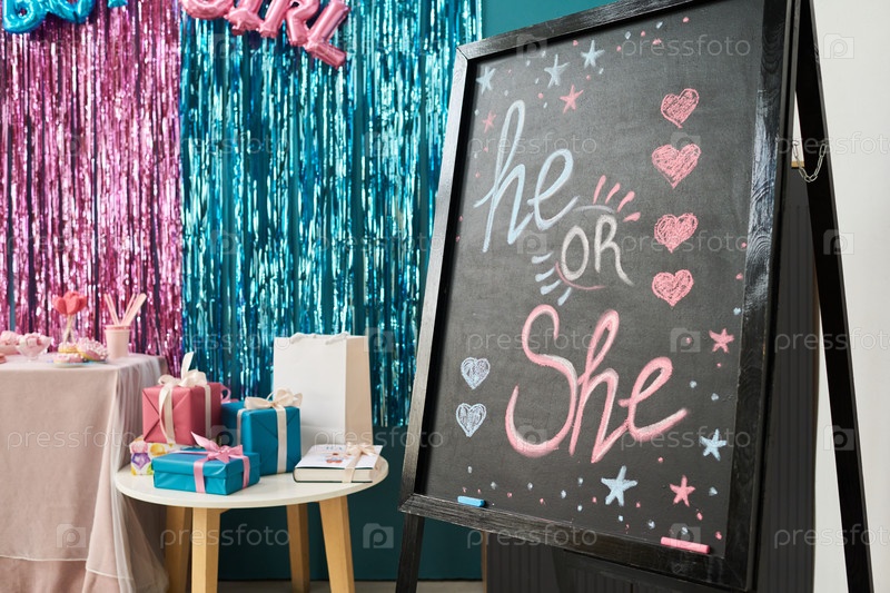 Сцена вечеринки с раскрытием пола, на которой есть знак Chalkboard Sign Displaying He or She Question