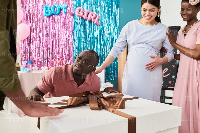 Чернокожий мужчина любит и открывает большую свадебную коробку на вечеринке по раскрытию пола