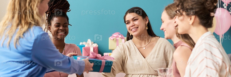 Группа молодых женщин, в том числе и чернокожая женщина сидят вместе на вечеринке по раскрытию пола