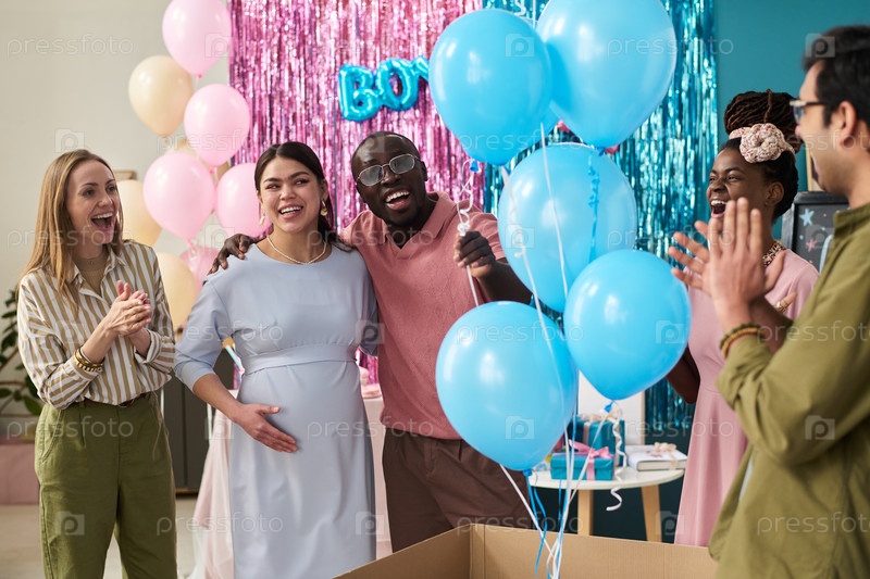 Мультиэтнические молодые взрослые празднуют вечеринку по раскрытию пола с помощью синих воздушных шаров