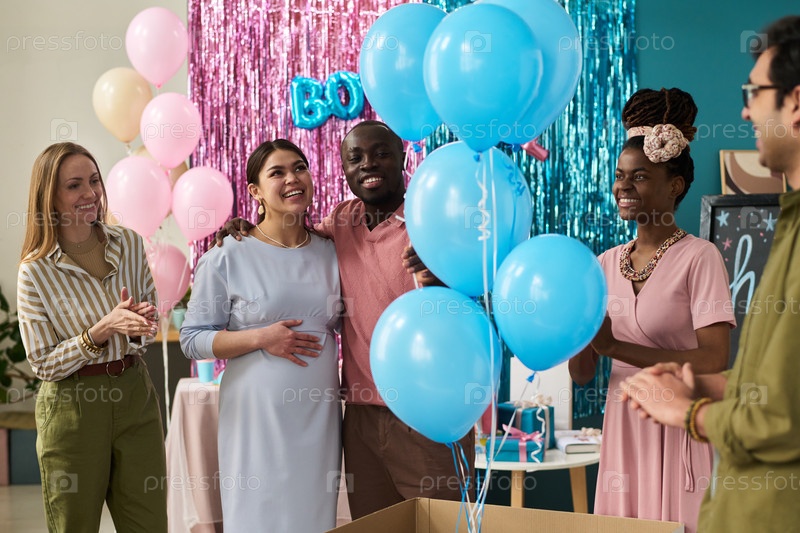 Разнообразные молодые взрослые улыбаются и раскрывают пол ребенка с помощью голубых воздушных шаров