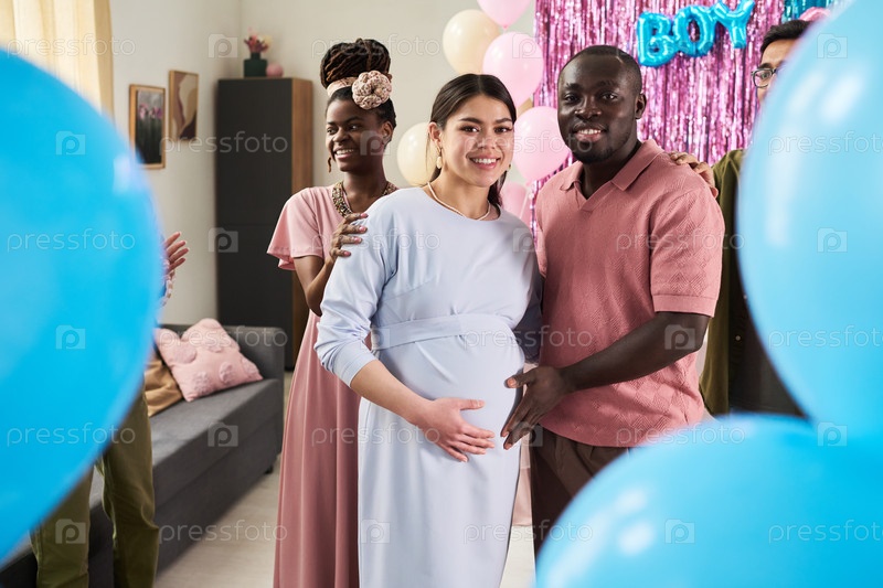 Мультиэтнические молодые взрослые празднуют половое откровение вечеринка улыбаются вместе