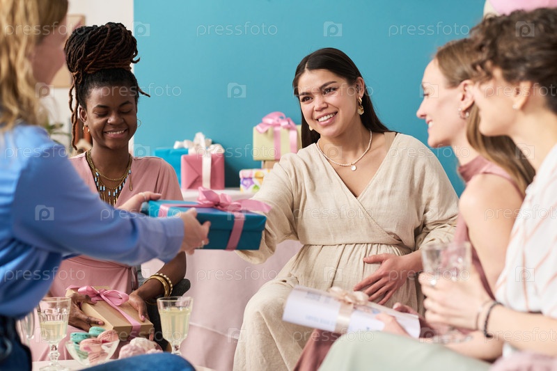 Мультиэтнические молодые взрослые женщины празднуют вечеринку по раскрытию пола и обмениваются подарками