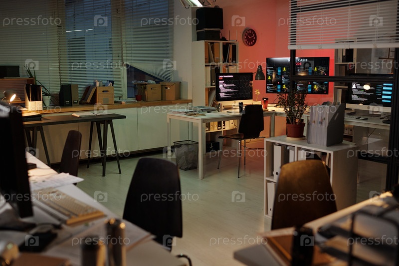 Несколько компьютерных экранов, показывающих мошенническую деятельность колл-центра в современном офисе