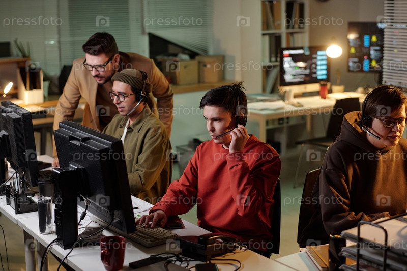 Молодые мультиэтнические мужчины, работающие на компьютерах в мошенническом колл-центре ночью