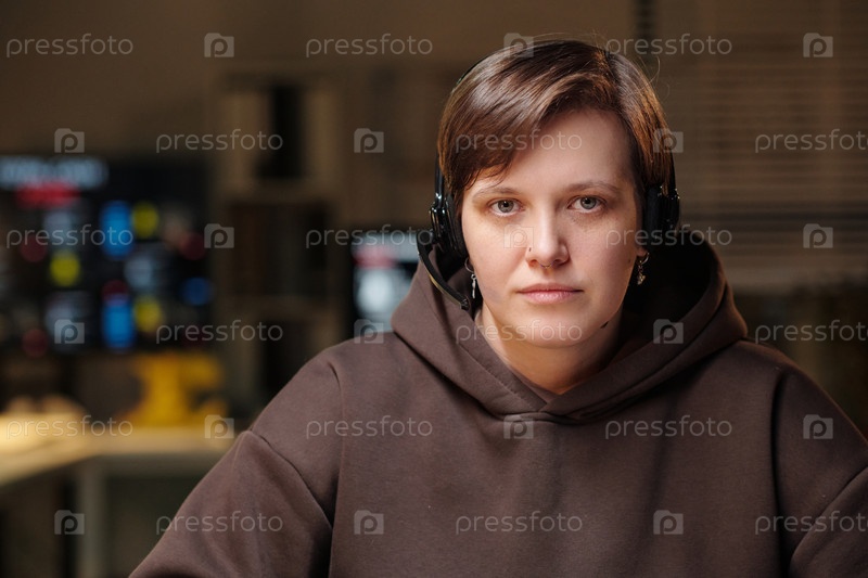Портрет молодой взрослой женщины, носящей наушники и управляющей мошенническими звонками
