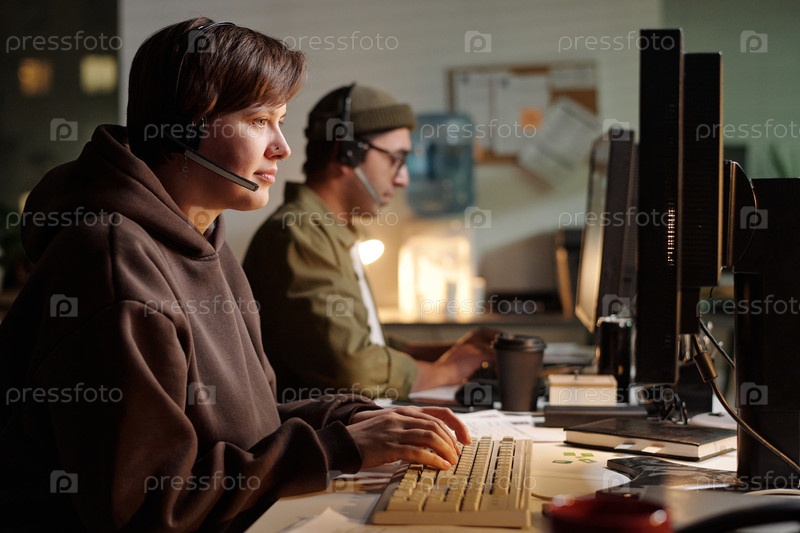 Молодая женщина и молодой мужчина работают с компьютерами в мошенническом колл-центре
